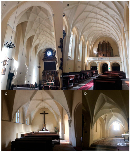 (A–D) St. Peter and Paul’s Church, Zagan, interior: (A) view towards the chancel; (B) the nave of the church; (C) Chapel of Our Lady of Sorrows; (D) Western vestibule (photos by the authors).