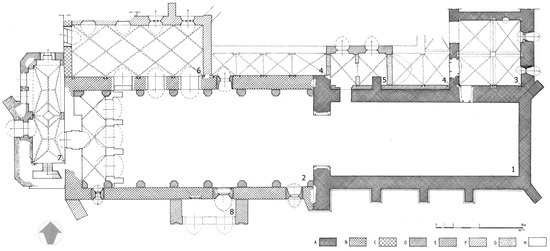 St. Peter and Paul’s Church, Zagan, with a part of the monastery, ground plan with chronological stratification of the walls (A—end of the 13th century; B—13th/14th century; C—second half of the 14th and early 15th centuries; D—first half of the 15th century; E—years 1486–1495; F—1514; G—second half of the 17th century and first half of the 18th century; H—walls not recognized) 1—chancel; 2—nave; 3—sacristy; 4—cloister; 5—Baroque sacristy; 6—Chapel of Our Lady of Sorrows; 7—Western vestibule; 8—Southern vestibule (compiled by the authors).