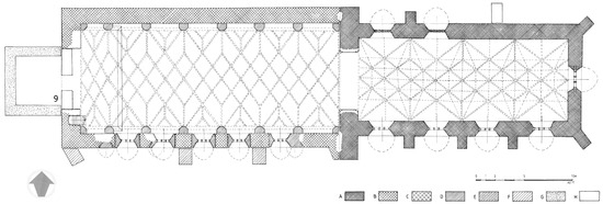 St. Peter and Paul’s Church, Zagan, projection at the height of the vaults with chronological stratification of the walls (A—end of the 13th century; B—13th/14th century; C—second half of the 14th and early 15th centuries; D—first half of the 15th century; E—years 1486–1495; F—1514; G—second half of the 17th century and first half of the 18th century; H—walls not recognized); 9—tower (compiled by the authors).