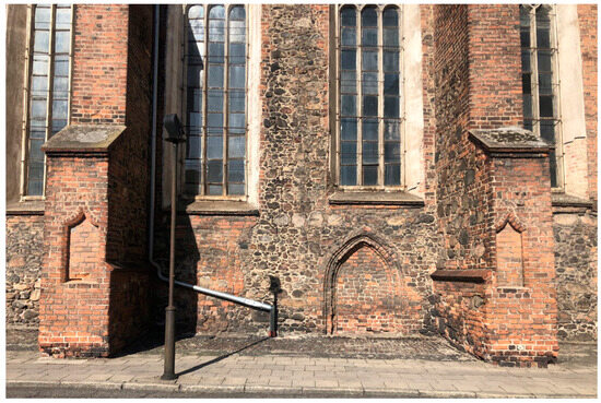 The size of the windows in the nave of the church has not changed. As in the chancel, new traceries were added to the windows. In front of the southern side portal, a two-span porch was introduced, the sidewalls of which were made up of two buttresses that were added on the line of the third and fifth pillar—counting from the east (Figure 8). From the south, the entrance to it was shaped in the form of two arcades, which probably had an ogival pattern. They were flanked by blends with a curtain pattern. The wall was crowned with a brick drip mold cornice, a trace of which is a chiseled-off brick that runs around the upper part of the recess. It probably formed the base of the attic wall covering the butterfly roof. The porch was covered by the vault that was based on the corbels of the side walls and on the recesses (one was carved in the wall of the nave, and the other in the pillar between the entrance arcades). In the eastern wall, there was a niche with a currently unknown pattern.