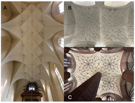 Diamond vaults: (A) Zagan, St. Peter and Paul’s Church, chancel; (B) Gdańsk, Assumption of the Blessed Virgin Mary Church, aisle; and (C) Pelplin, Assumption of the Blessed Virgin Mary and St Benedict, St Bernard, and St Stanislaus’ Church, north transept (Photo by the authors).