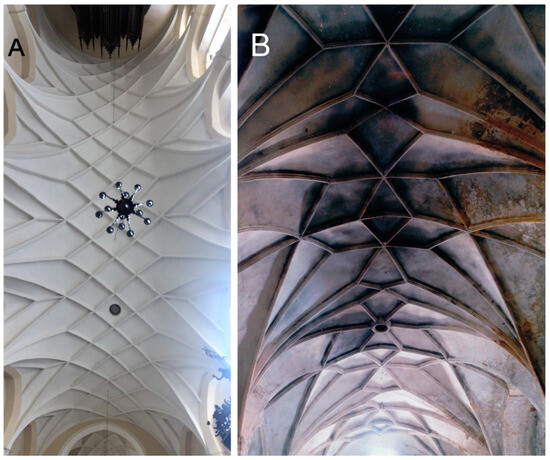 Net vaults: (A) Zagan, St. Peter and Paul’s Church, nave and (B) Brzeg, St. Peter and Paul’s Church, nave. (Photos by the authors).