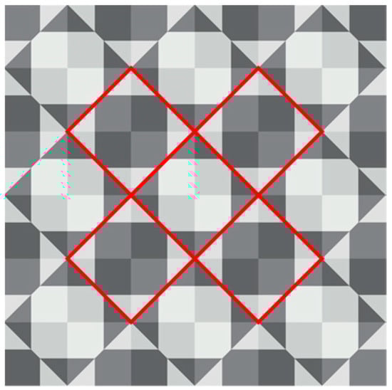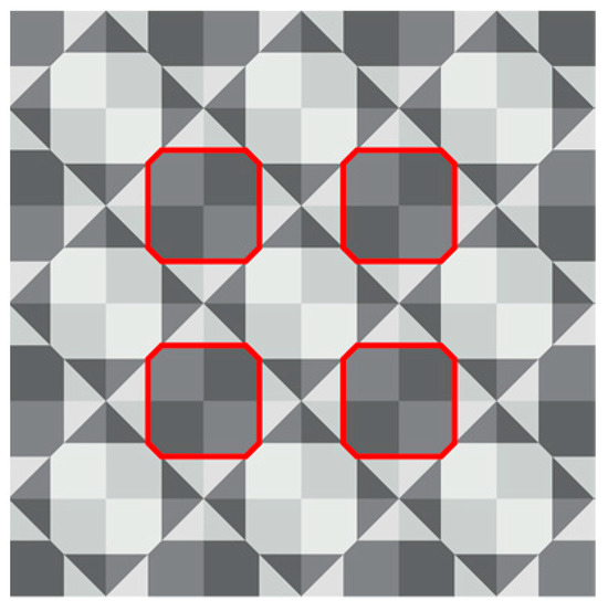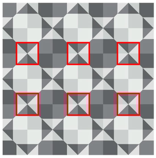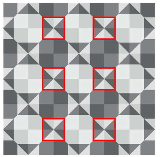 An analogous—though further reversed—situation may be observed in Figure 3. Again, the perceiver sees six identical figures, but they are aligned differently than in Figure 2. Also, the colour scheme in each identified image is inverted, as darker shades of grey are at the top and bottom of each image, while lighter shades are on the left and right.