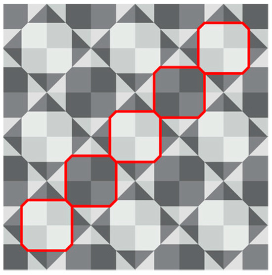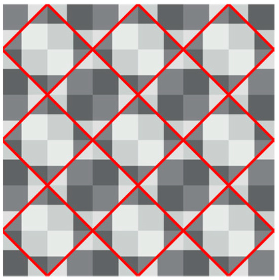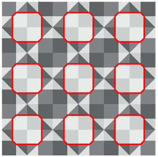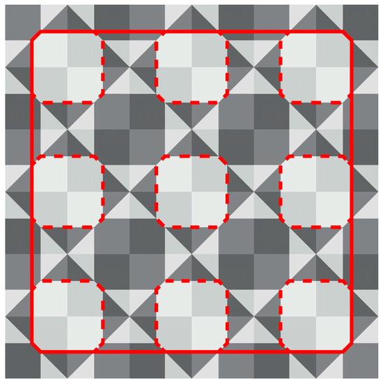Finally, Figure 9 demonstrates that it is possible to analyse an image as a large square with rounded corners (red solid line) whose field exceeds the previously described figures. In addition, the perceiver may arrive at a mental image of further smaller structures inside that large field, such as the minor squares with rounded corners composed of lighter elements marked by the dotted line.