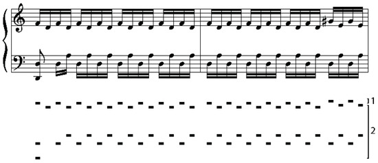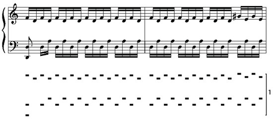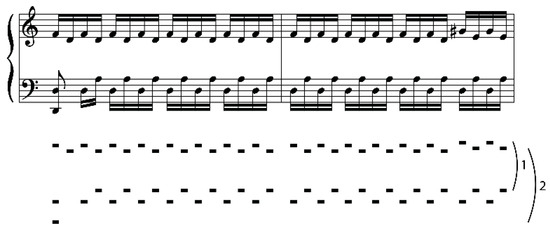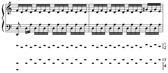 Figure 10, Figure 11, Figure 12, Figure 13, Figure 14 and Figure 15 show a two-bar fragment of Ludwig van Beethoven’s Piano sonata C Major (Waldstein), op. 53, no. 21, Allegro con brio, m. 14–15, a piece that may be perceived and interpreted differently by listeners depending on the auditory element which draws their primary attention. The example presented here is intended to demonstrate the varied analytical properties of the auditory image which arise in the course of exposure to musical works, directly transposing earlier examples in the form of computer graphics (Figure 1, Figure 2, Figure 3, Figure 4, Figure 5, Figure 6, Figure 7, Figure 8 and Figure 9) into music.