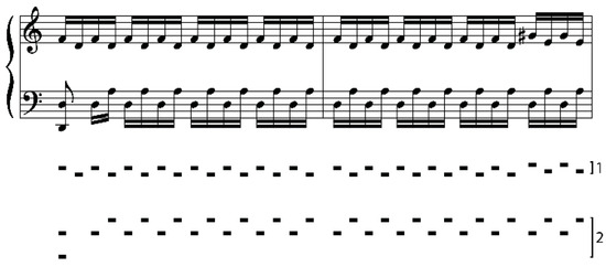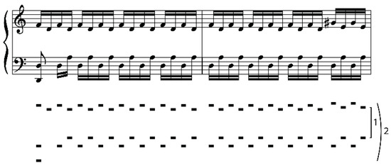 - Variant no. 2: The perceiver also hears two perceptual streams, although the first stream is formed by the sounds assigned to the right hand together with the two highest notes from each sequence consisting of six sixteenth notes. The highest notes performed with the left hand are played simultaneously with the melody in the right hand’s part (their attack is identical), which causes the integration of both sounds into a single perceptual stream (Bregman 1990). In this case, the listener also perceives a melody created from dyads because at moments where the two highest notes performed in the part of the left hand occur, the difference in the pitch of the sounds written in the left- and right-hand parts decreases, causing the integration of sounds.
