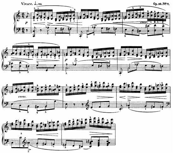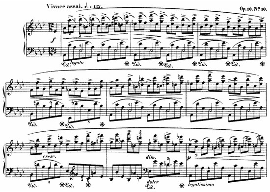 Frédéric Chopin, Etude C Major, op. 10, no. 7, Vivace, m. 1–11. Source: https://imslp.org/wiki/Special:ImagefromIndex/168185/cy28 (accessed on 2 February 2024).