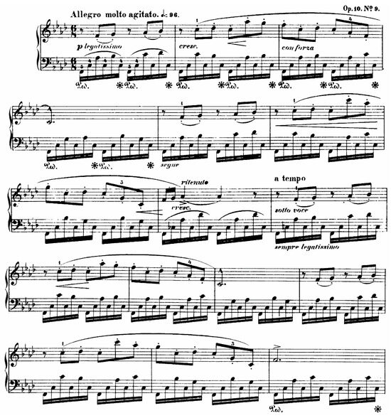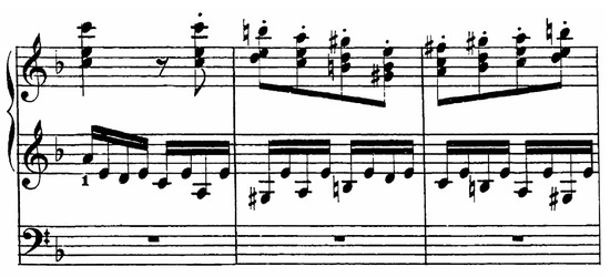 Frédéric Chopin, Etude F Minor, op. 10, no. 9, Allegro molto agitato, m. 1–16. Source: https://imslp.org/wiki/Special:ImagefromIndex/168185/cy28 (accessed on 2 February 2024).