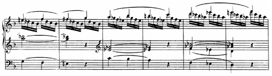 In measures from 25 (Figure 21) to 36 (Figure 22), the listener can observe the transition of voices (transferring the continuity of the perceptual stream) between the left- and right-hand parts. Since the construction of the stream, in this case, is not homogeneous because the sixteenth-note triplets and the regular sixteenth-note passages draw the listener’s attention much more, they can integrate into a single perceptual stream (based on rhythmic similarities) in the measures chosen by the listener.