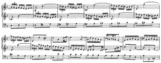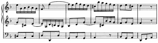 Jan Sebastian Bach, Sonata D Minor, no. 3, BWV 527, Vivace, m. 31–36. Source: https://imslp.hk/files/imglnks/euimg/7/7b/IMSLP867601-PMLP152882-Bach_Triosonate_d-Moll.pdf (accessed on 10 March 2024).