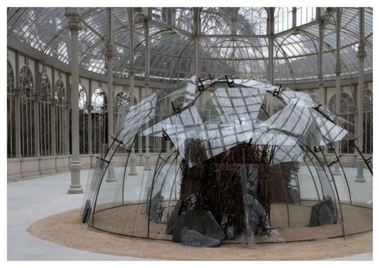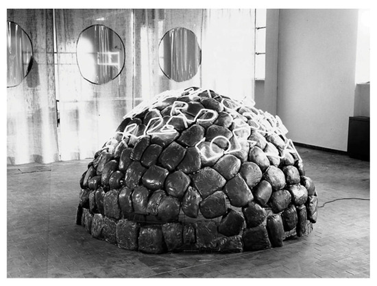 Merz’s materials are as adaptable as those of a nomad. Clamps and arches can hold glass plates or mats, secure skins and bundles of branches, and accommodate large slabs or stones and car doors. Everything is reduced to the enigma and the nomadic energy (Celant 1979, p. 53). In contrast to tectonic constructions, these igloos lack a stable structure, giving them an inherent instability that evokes a sense of vertigo, as if they could collapse at any moment. The internal tension between balance and imbalance complements the tension between exteriority and interiority. The previously mentioned impenetrability is nuanced by the transparency of glass in some igloos, giving them a visually open character, even if they are not practically accessible. Even in those igloos where opaque materials like earth and clay dominate—such as Objet-Cache-toi, Iglú de Giap (Figure 3) and Ché Fare, all constructed in 1968—the artist adds neon elements with the intention of destroying, dematerializing, and deconstructing. In Merz’s own words, neon allows him to “hide the object, that is, to plastically erase it, to nullify it” (Merz; Celant 1979, p. 54).