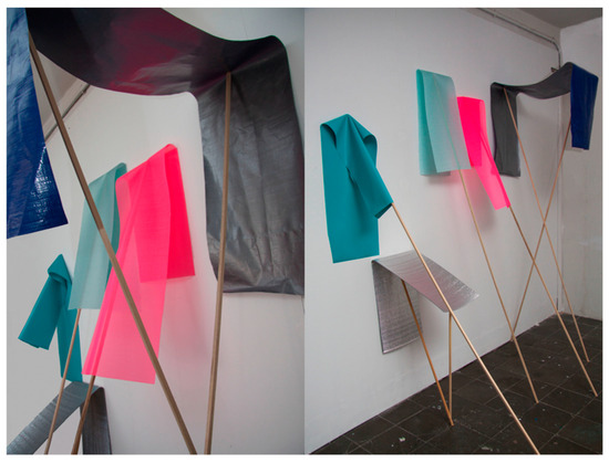Finally, Baker emphasizes that the conditions characterizing the “nomadic sensibility”—contingency and provisionality—that evoke admiration for their “resourceful versatility” (Baker 2018, p. 292) also generate mistrust due to their perceived lack of accountability and rootedness. Nevertheless, Baker maintains a positive stance in his writings. Perhaps more relevant to the argument of this study is how Baker identifies the potential of Roma aesthetics and how the vocabulary of materials offers new possibilities for communication among heterogeneous, mobile groups. This positive perspective aligns with Braidotti’s concept of nomadic and even transnational subjectivity, as will be developed in the analysis of Jimena Kato’s work and her material vocabulary.