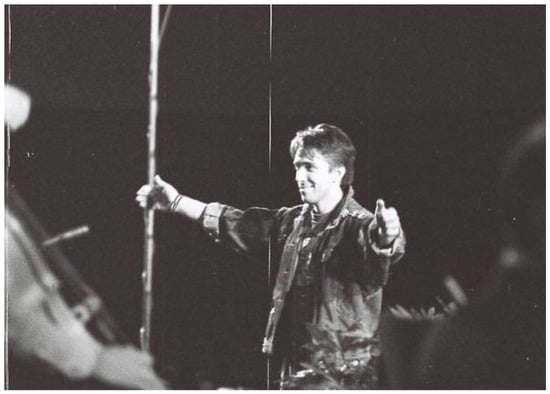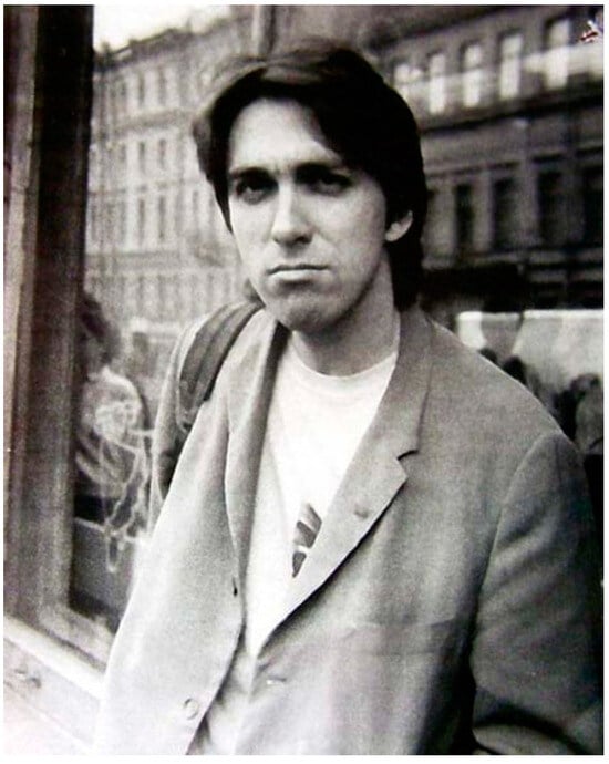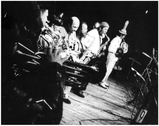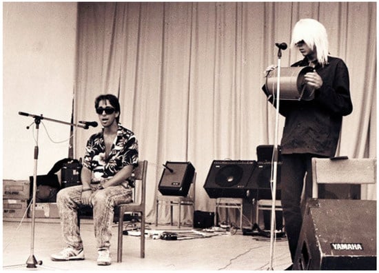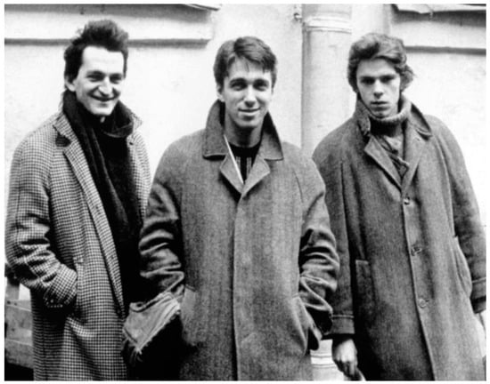 Even during that period, contemporaries remarked on Kuriokhin’s exceptional piano dexterity, his perfect pitch, and, one could argue, his prodigious musical memory. As he later lamented in an interview: “Once I hear any piece of music, I remember it for the rest of my life and can play it from any place without any preliminary preparation. I want to forget it, but I can’t. It disturbs me terribly”. Kuriokhin was interested in all possible musical directions—classical works and their experimental branches, traditional and avant-garde jazz, rock in all its polymorphous manifestations. And all this he played every day for many hours wherever possible: in private apartments, Soviet clubs, festivals, on dance floors in the suburbs, moonlighting as an accompanist at the swimming pool for synchronized swimming, for physical training breaks of workers of the Kirov factory and amateur amateurism at the police club. In parallel, he actively made new acquaintances among the creative bohemians of Leningrad and the extraordinary intellectual environment, in such areas as philosophy, history of religion, theosophy, mysticism, semiotics, personalism, phenomenology, literary studies, and even microbiology. Active in the Saigon Café, a meeting place for informal members of Leningrad’s underground life in the very center of the city at the corner of Nevsky and Vladimirsky avenues, Kuriokhin quickly formed useful connections with artists, poets, writers, musicians, professors, directors, actors, bibliophiles, and music connoisseurs, as can be seen in Figure 1, Figure 2 and Figure 3.