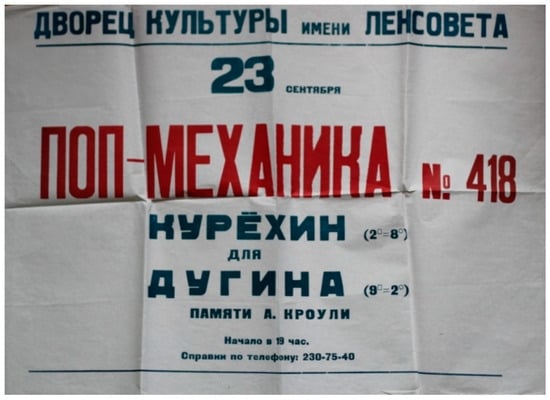 - Bukharin, Andrej, and i Tat’iana Baidakova. 1995. Interv’iu s Sergeem Kuriokhinym ob energii Alistera Krouli i okkul’tnoi istorii Peterburga. Available online: https://pikabu.ru/story/sergey_kurekhin_vse_chto_ya_govoryu__chistaya_pravda_5655681 (accessed on 10 January 2025).