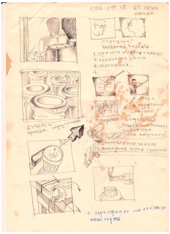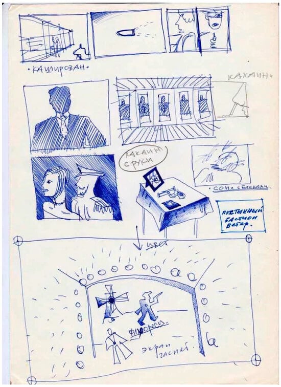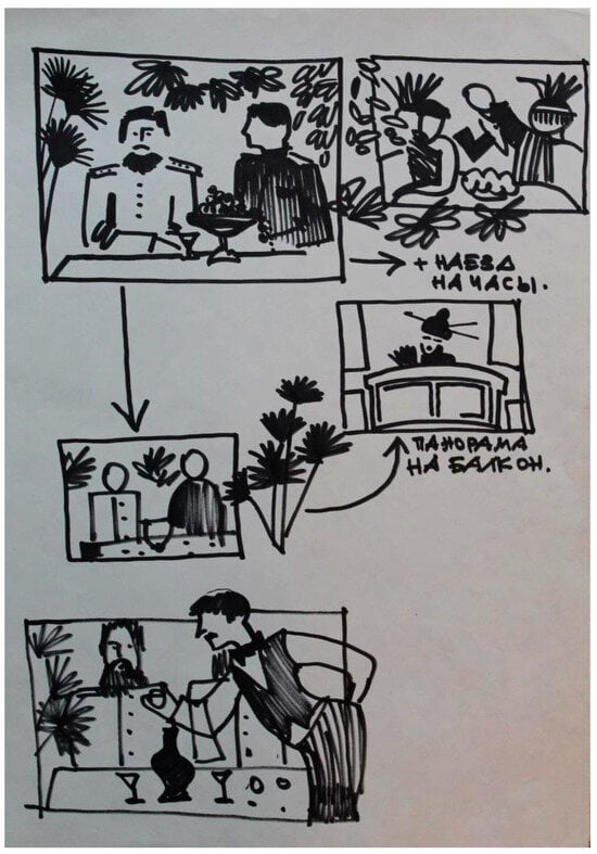Kuriokhin and Debizhev had been acquainted since the early 80s, but their friendship deepened significantly in 1991 when they collaborated on the script for Two Captains 2 at Lenfilm Studios (Figure 8). Their bond was so profound that they remained inseparable until Kuriokhin’s passing in 1996. This collaborative project vividly exemplifies Kuriokhin’s ability to exert influence and reshape creative endeavors across various domains. His musical albums underwent radical transformations, with compositions imbued with novel forms, arrangements, and original sounds often crafted through collaborations with a diverse array of musicians. His charisma and erudition often led to him taking over hosting duties in TV and radio programs, or even rewriting entire scripts for films, a testament to his magnetic presence and unwavering influence over creative processes. As he once remarked, “You see, Sergei, the main thing is not to limit yourself in creative fantasies. If possible, constantly exercise in inventing and developing new, the most unfulfilled, unrealistic and delightful ideas. And when they reach completely absurd proportions, you need to urgently involve people close in spirit, so that they further developed these stories and brought them together with you to the full delirium and schizophrenia. And this is where the strangest thing always starts to happen, that it all starts to work and materialize into reality. That is why you should never stop. And it is necessary to believe that everything you dream of and want can be achieved. The main thing is to believe. And people will help you. And they will follow you”.
