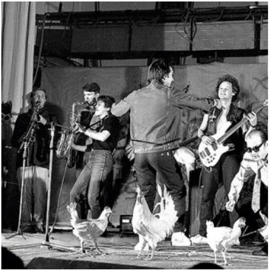 Kuriokhin’s magnum creative and transgressive opus, ‘Pop Mechanics’, serves as the focal point of this essay’s exploration of his interdisciplinary innovations (see his own descriptions in , , , , , , ). This postmodernist experiment dismantled conventional artistic hierarchies, integrating elements from disparate traditions—jazz, classical music, rock, circus performances, and theatrical spectacle—into an anarchic, unpredictable whole. Deeply informed by the methodologies of Dada and Surrealism, ‘Pop Mechanics’ transcended mere performance, functioning as a philosophical statement on the fluidity of artistic boundaries. The chaotic, often improvisational nature of these performances embodied Jean-François Lyotard’s postmodernist skepticism toward grand narratives, challenging the rigid categorizations of artistic expression while embracing irony, absurdity, and pastiche as vehicles of cultural critique (; ).