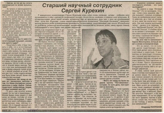 “Sergei Kuriokhin—the Senior Scholar (of Russian Stiob)”, newspaper Ya Molodoi, No.3, 1995.