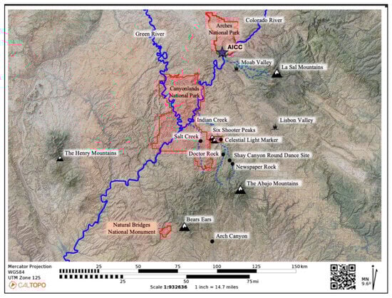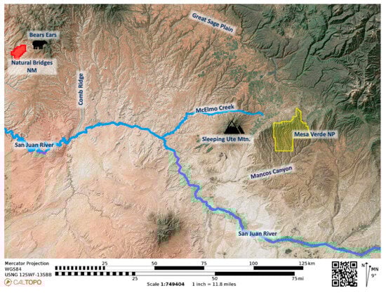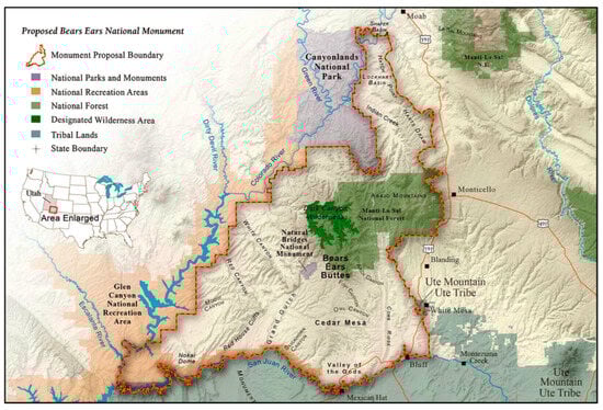 - Bears Ears Intertribal Coalition. 2025. Bears Ears National Monument Map. Available online: https://www.bearsearscoalition.org/wp-content/uploads/2017/01/uw_BearsEars_Proclamation_8.5x11.pdf (accessed on 11 February 2025).