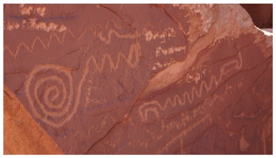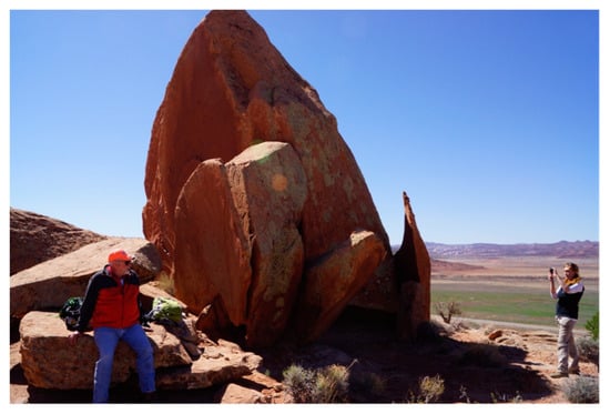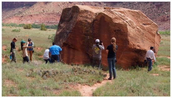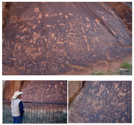 An example of the range of interpretations provided by pueblo representatives is that from Acoma. At the Doctor Rock site, Acoma Pueblo representatives expressed that they felt deep connections with the Indian Creek area, interpreting it as a part of their ancestors’ sacred migration journey to their current home. While detailed symbol-specific interpretations were not provided due to cultural sensitivity issues, Acoma Pueblo representatives shared that some of the symbols on the Doctor Rock narrate the Acoma migration histories and represent landmarks of the migration journeys of the early Acoma people. They also emphasized that such places as the boulder and other similar spots within the Indian Creek area, including Newspaper Rock, are alive, as they are able to remember stories and names that were and are told to them. The Acoma people thus still visit these places of rocks, canyons, and rivers in their dreams and prayers and, to this day, speak to them as is appropriate for communication with living beings.