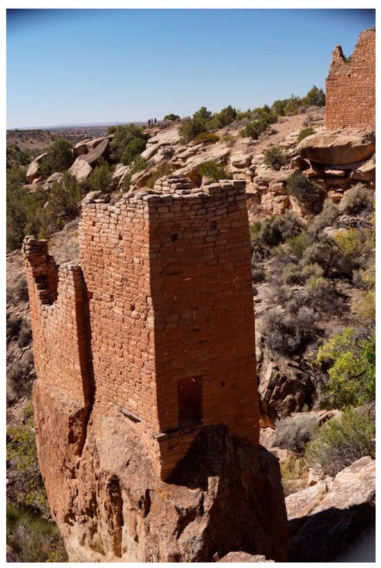 Hovenweep National Monument is composed of Celestial Light Markers that include walls that were engineered to have holes through them to permit the passage of celestial light (Stoffle et al. 2019, 2020). Some structures were built in relationships with each other so that they marked time with shadows of light between and on buildings. Tall, multistoried stone towers were built to view the sky, pray to distant Sky Islands, and conduct ceremonies. Some prayers were made to at the springs below the towers through the massive rocks on which they were constructed (Figure 6).
