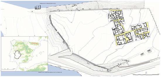 Today, the ruins of Albalat stand several kilometers from the nearest populated area, solitary on the banks of a small valley in the central section of the Tagus River (Figure 1). This initial impression of isolation can be misleading. Its town walls, built at the end of a small river terrace overlooking the river, stand as a testament to its period of splendor and its prominent role in controlling the communication route. In fact, Albalat was located at one of the few points where the Tagus River could be forded during medieval times. This strategic location, as a crossing point on the ancient route linking Mérida and Toledo, gives meaning to its full toponym, Majāḍat al-Balāṭ or “the ford of the road”. This significance may also explain why it was mentioned alongside important cities such as Toledo and Talavera in the treatise of the eastern geographer Ibn Ḥawqal, written in the mid-10th century (Ibn Ḥawqal 1971, p. 15; Al-Balāṭ 2017, pp. 15–19).