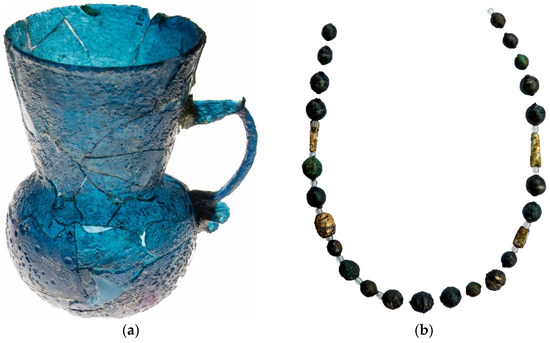 (a) Small blue glass jug restored at the Higher Schools of Conservation and Restoration of Cultural Assets in Madrid; (b) necklace with copper alloy and glass beads restored by B. Sanmartín Freitas with funding from the Casa de Velázquez. To assemble the necklace, transparent glass beads were placed between the different elements to minimize friction as much as possible.