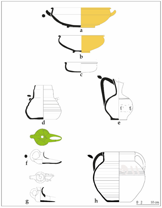 Ceramic drawings by Y. Cáceres Gutiérrez (Figure 5a,d,e and Figure 7a,b), Paula Garrido Amorós (Figure 5g), Cristina I. Mena Méndez (Figure 5b,c,f,h), and J.-C. Tréglia (Figure 6 and Figure 7c), and CAD by S. Gilotte (Figure 5g and Figure 7a), Cristina I. Mena Méndez (Figure 7f), J.-C. Tréglia (Figure 6 and Figure 7c), and C. Velien (Figure 5e and Figure 7b). The authors would also like to thank Anna-M. Llambrich Howard as well as the editor for reviewing the English translation.