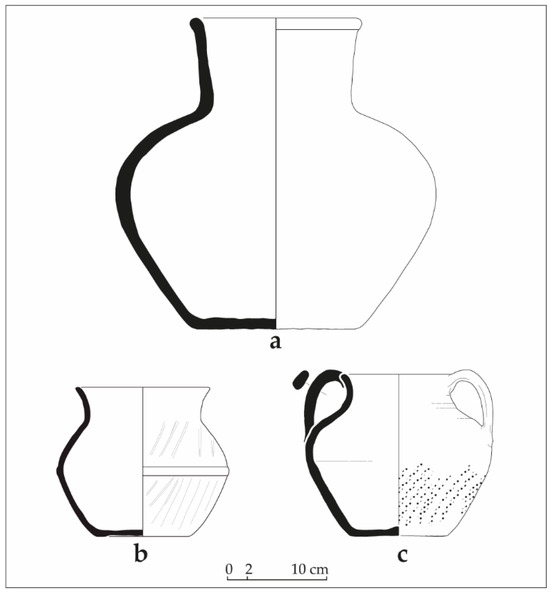 Examples of Christian or Christian-influenced ceramics: (a) small storage jar, handcrafted or made on a slow wheel; (b) cooking pot with burnished lines; (c) two-handled cooking pot with traces of burnishing on the lower body.