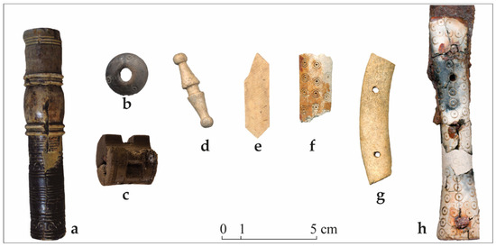 Samples of bone and deer antler artifacts from Albalat: (a) distaff; (b) spindle whorl; (c) crossbow nut; (d) button; (e) box overlay plaque; (f) faceted fragment with incised decoration; (g) handle; (h) detail of a decorated knife handle.