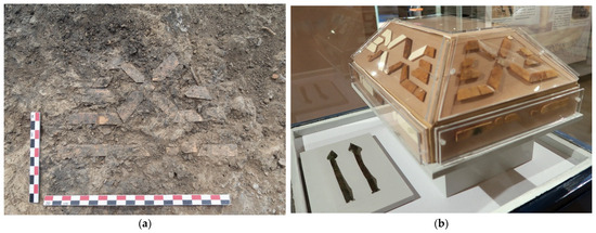 Among these crafted remains, a set of small bone plaques stands out, along with two large, gilded copper fittings found flattened on the earthen floor of a room (Al-Balāṭ 2017, pp. 117–20). The most complete set facilitated the identification of a trapezoidal panel, likely the side of a lid, measuring approximately 21 cm in length by 12 cm in height (Figure 9a). The bone elements, beveled at the edges, formed a cross-shaped motif centered around a gilded diamond. At the bottom, a border alternated between tongue-shaped and oval pieces. The second set, more deteriorated, featured the same composition and dimensions, revealing a well-preserved lower row with traces of gilding. The third group corresponded to the front (or back) face of the lid, also trapezoidal (34 × 12 cm), with the same characteristic beveled edges. These elements reliably allow for the reconstruction of a five-panel coffin-style lid (four side panels and a top panel, which is missing), associated with a rectangular box body (Figure 9b).