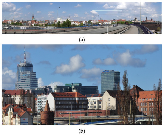 (a,b) Panoramic, dynamic view from the motorway, entering the city of Szczecin, driving towards the two iconic high-rise buildings. In the enlarged photo, left: Pazim Building; right: Hanza Tower Building. Photos taken by authors.