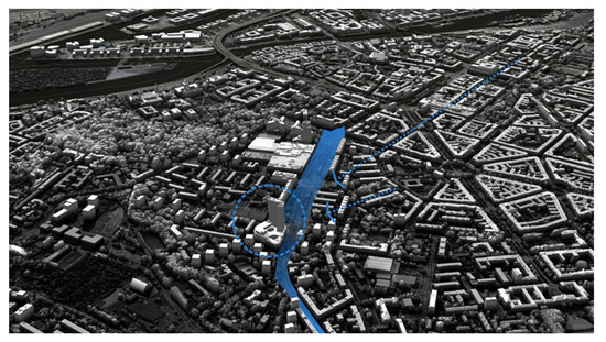 Localization of the Hanza Tower in the urban composition, with selected street axes highlighted in blue. Visualization of DSM model of Szczecin by authors.
