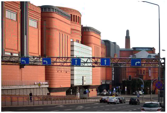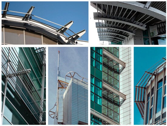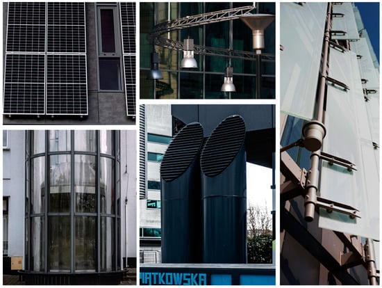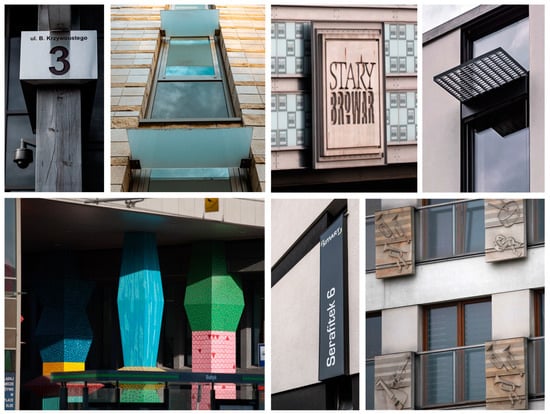 It turns out that the presence of new forms of decoration applies to all examined structures. Many aesthetic architectural additions do not result from the function or structure of the buildings. Designers have demonstrated their “creative” potential and their “novelty” in creating various elements that pretend to have technical function. They constitute rather strange constructions, forms, structures, or additions that, in most cases, have no function other than an aesthetic one. Most of the decorations are of low or average artistic and craftsmanship value. Ready-made commercially available elements are also frequently used. The shapes of most objects, reduced to simple cubic forms, present heavy and random proportions. These result from the simple “packing” of functions imposed by economic considerations. Despite the current paradigms of modernity, building solids are superficially masked with decorative additions and visually diversified with many forms and structures. This fact reveals architects’ concerns about the blank wall. Positive examples of buildings with interesting layouts and proportions and well-adjusted details are the Stary Browar shopping center (