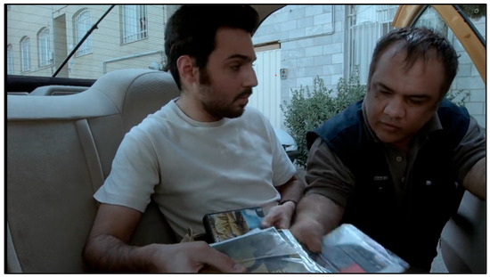 Furthermore, the car’s social space, oscillating between private and public, is exemplified in another scene where the driver’s niece, waiting in the car, witnesses a beggar boy outside of the car attempting to pick up the money dropped on the ground by a passing man who appeared to be newly wed (Figure 6). This incident underscores the car’s function as a site to see the unnoticed or hidden realities of social inequality and unease, despite its illusion of being a contained, private environment. These random encounters through movement open windows into the Iranian social fabric, revealing the city to the viewer like a text (Euler 2002), akin to de Certeau’s walking experience: “These practices of space refer to a specific form of operations (‘ways of operating’), to ‘another spatiality’ (an ‘anthropological,’ poetic and mythic experience of space), and to an opaque and blind mobility characteristic of the bustling city. A migrational, or metaphorical, city thus slips into the clear text of the planned and readable city” (de Certeau 1984, p. 93).