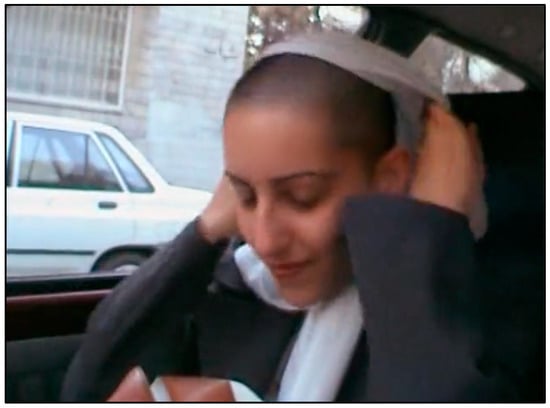 In Ten, Mania engages in reflective, embodied, and emotionally charged driving practices that disrupt the usual gratification linked to voyeurism, fetishism, and the patriarchal spectacle for the audience (Boczkowska 2023b). Mania’s driving is not defined by issues like single motherhood or domestic abuse but rather by an act of resistance against normative femininity and the establishment of a connection across shared women’s experiences. Mania’s interactions with a prostitute, a girl grieving her lost relationship, and a shy girl shaving her head and removing her scarf (Figure 7) all demonstrate how the car destabilizes conventional social boundaries and norms for female characters (Andrew 2005). Moreover, the car space also serves as a semi-domestic space, offering discussions that are otherwise hard to conduct among family members, such as Mania’s conversation with her sister or her son.