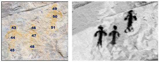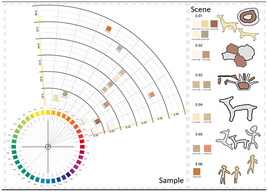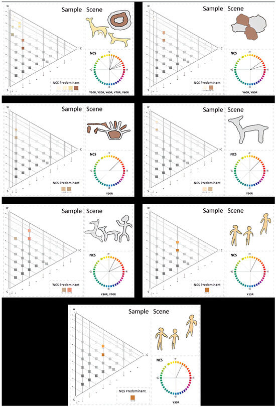 In all the analyzed scenes, a clear predominance of the hue between yellow (Y) and yellow–red (YR) is evident, particularly in tones such as Y30R, Y50R, and Y60R. This chromatic concentration indicates a repeated use of warm shades that range from yellowish and reddish ochres, visually associated with the colors of the earth and the surrounding natural environment. The choice of these hues suggests a certain visual intentionality in harmonizing the figures with the rocky support and the landscape (see Figure 9).