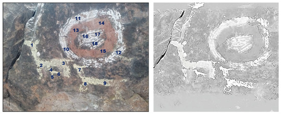 In this section, a 50 cm circle is highlighted, radiating lines reminiscent of the sun, flanked on both sides by four clear marks. The shades S3010-Y50R and S3020-Y60R were used, mixtures of yellow with a hint of red that enhance the image. Although the surface is somewhat damaged by cracks in the stone, the image remains recognizable. This recurring design in other areas of the southern Andes suggests that it may have a ritual significance related to the sun (Hostnig 2024) (see Figure 5).