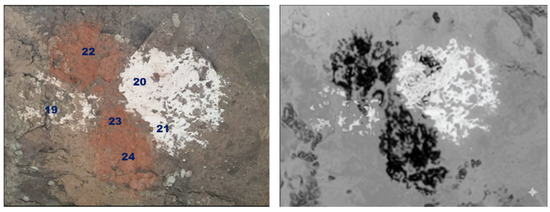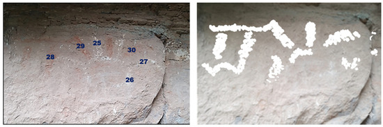 Before any measurements were taken with instruments, high-quality photographs were captured of each of the six selected locations. A digital single-lens reflex camera with an APS-C sensor and a standard 50 mm lens was used, ensuring minimal visual alteration. The images were saved in RAW format to preserve the color data intact. The photographs were taken using soft natural light, avoiding reflections or direct light to prevent affecting color interpretation. Each location was photographed from a distance of about 50 to 100 cm, depending on the size of the panel, maintaining a right angle with the surface of the rock to reduce visual distortions.