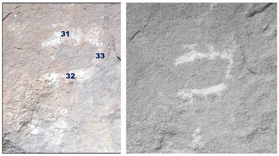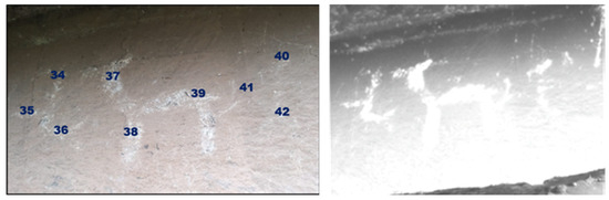 For each of the figures appearing in the six scenes (whether human figures, animals, or geometric shapes), areas were selected that clearly displayed the color tone. Care was taken not to choose areas with pathologies (such as white spots, wear, moss, or black crusts), always seeking locations where the color appeared uniform and free of surface layers. At each of these selected points, three consecutive measurements were taken using the XRite Capsure™ 2.0 spectrophotometer. The measurements were conducted by placing the device directly against the surface (without applying pressure), following the manufacturer’s instructions for preparation. Each time a measurement was taken, the device automatically stored it and converted it to a natural color system (NCS) coordinate system. This provided information on the hue (W), the blackness (S), and the chromaticity of the color (C), along with a code consisting of numbers and letters. It was verified that these measurements matched the colors from the NCS atlas to ensure that what we observed was accurate.