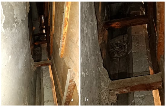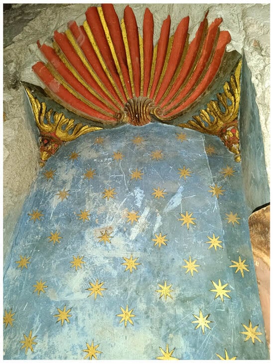 The restoration of the front area of the ancient qibla wall will be vastly more arduous to undertake. Access to the hidden area had to be gained through the right rectangular panel of the first storey of the altarpiece, at the beginning of the side part, and between the two column bases. This panel serves as a lowered door, implemented at the time, to enter this space and facilitate structural repairs or specific damages. Still, above all, this passageway connects with a narrow wooden staircase between the qibla wall and the altarpiece, which ascends diagonally up to the low central niche where the image of Saint Anne teaching the child Virgin to read is located today. Incidentally, this stairwell is currently unusable and in a notable state of disrepair, so much so that it is in danger of collapsing.