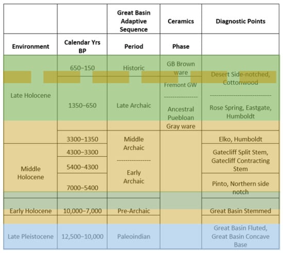 Regional Nevada culture periods correlated with broad climatic indicators (wetter—green; drier—brown; blue—colder/wetter).