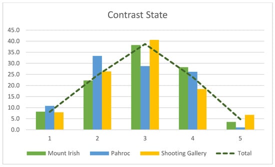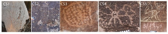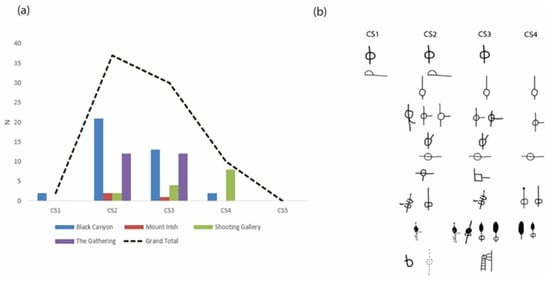 These motifs were found amongst the earliest weathering state (CS1) but were dominantly and equally distributed between C2 and CS3 (Figure 12). Most Water Babies were found at Black Canyon, where most of these occurred in CS2. Mount Irish figures were between CS1 and CS4, Shooting Gallery in CS2–CS5, and The Gathering only in CS2 and CS3.