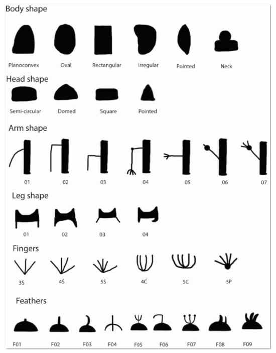 A sample of 208 patterned-bodied anthropomorphs were analysed for this study (Figure 15 and Table 2): from Black Canyon (74: 35%) and The Gathering (68: 33%), Shooting Gallery (43: 21%), and Mount Irish (23: 11%). The PBAs were technically geometric in form, with their shape and patterned infill representing a combination of the region’s key geometric elements (i.e., knotted string, rakes, dot patterns, and angular forms). They rarely had defined heads and limbs, a feature that distinguishes them from their Coso Range counterparts. More than half (59%) of these motifs had no arms, 51 (25%) had 1 arm (usually associated with an atlatl), and 41 (19%) had 2 arms. Associations with atlatls (on the left and/or right side of the body) were recorded, as were arm morphologies.