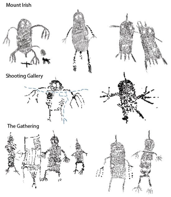 - Those from Mount Irish tended to have the most variability in body shape (distribution on Dim2), splayed legs (Type 2), and exaggerated arms with large digits, with round heads and square (planoconvex) bases. Several have been ‘refreshed’ or superimposed by newer motifs.