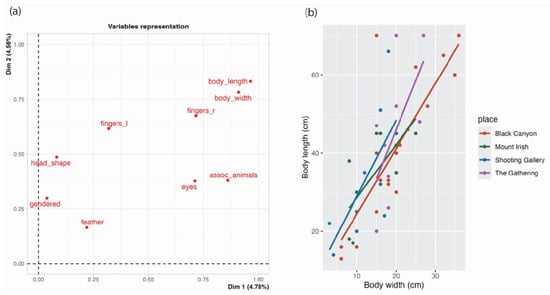 MCA SBA bivariate plot showing variable scores (a), and (b) regional variation in body size (length × width) at the four site complexes (line of best fit shows trends).