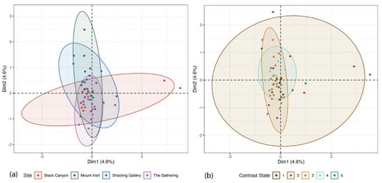The MCA confirmed, however, that no one place appeared more, or less, stylistically varied than any other (Figure 14). If one of these site complexes were an aggregation locale, for instance, whether a mixed group of artists came together and produced these figures (e.g., after ; ), then greater stylistic variability, and the full regional repertoire, would be expected in that place. Several characteristics and schematic conventions were unique in each place, and the Pahranagat solid-bodied figures showed the following: