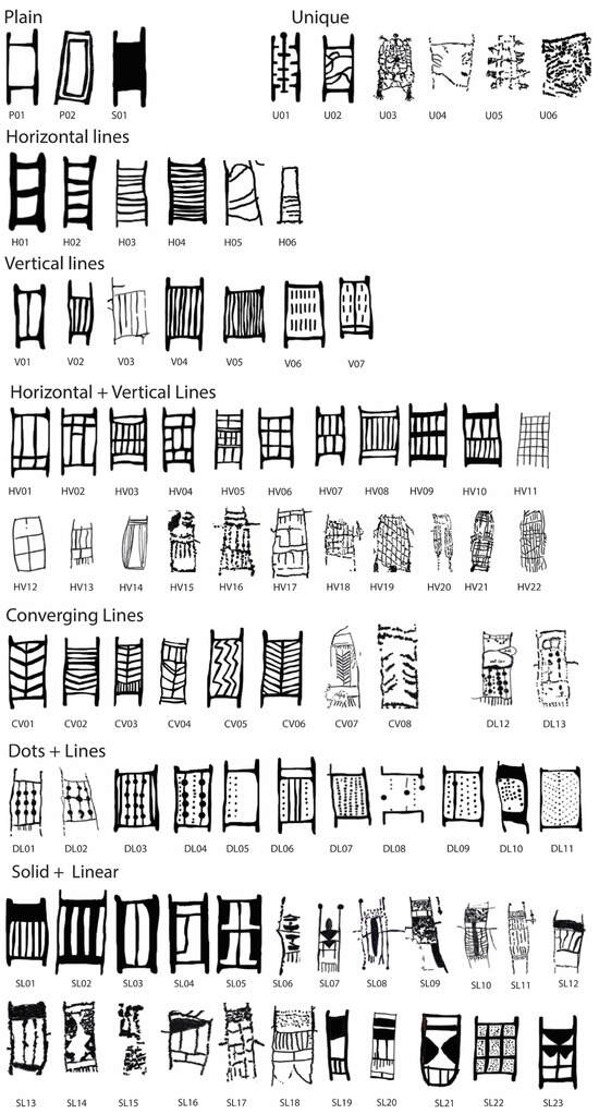 Many—but not all—interior designs were unique (i.e., 34 designs occurred only once; see also ). While there was extreme design variability, 78 classifiable designs were counted in 8 broad design categories (Table 2; Figure 15 and Figure 17). The most common design (found 11 times) was a simple vertical form (V02). Patterning was observed in the distribution of these core design elements across the four analysed site complexes/subregions.