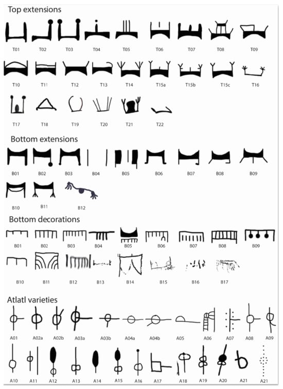 PBA design elements analysed in addition to size dimensions. Atlatl types include variations where the arm is included in the design (cf. associated proximally). The square A17 atlatl design (attached with an arm) is like several illustrated from the Jeffers Site (Minnesota) by ().