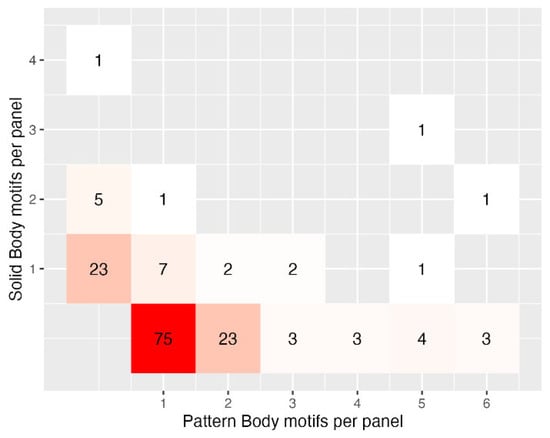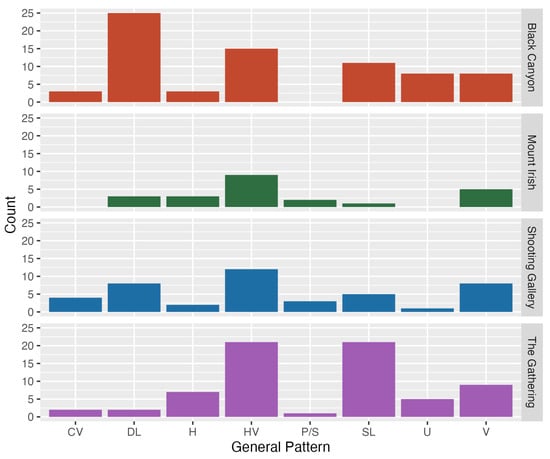 Only three designs were found at all four locations (V01, V02, and H03), while another four designs (H04, HV11, DL03, and SL13) were found in different combinations at three of the four site complexes. Three site complexes (but not Mount Irish) had designs that were unique, although most of these were one-off designs. There were, however, repeated examples that were not found at other places, e.g., at Black Canyon: DL04 (n = 7), SL05 (n = 4), and HV02 and DL10 (2 each), as well as 11 other unique designs. At The Gathering, HV19 (n = 4) and SL17 (n = 3) were unique to this place, along with 25 unique (i.e., n = 1) designs. Black Canyon and The Gathering shared the most designs (Figure 18), of which 18 designs were not found elsewhere. There was a small but significant relationship between the PBA general pattern and site complex (chi2 = 61.66, p = 0.001; adjusted Cramer’s v = 0.19), with more Dot + Line (DL) designs occurring at Black Canyon, and an inverse relationship at The Gathering, where there were more Solid + Line (SL) designs. This design variability is in keeping with these two site complexes being ritual centre(s)/aggregation locale(s) (sensu ; ).