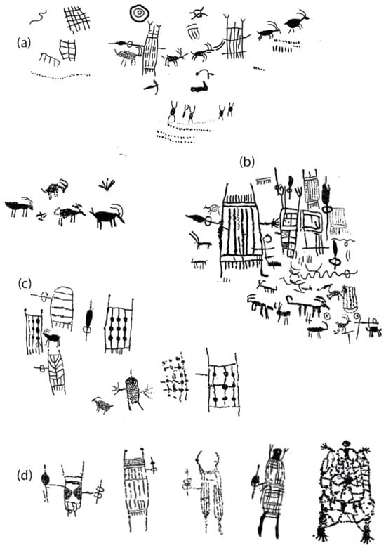 Black Canyon (site 26LN810) solid-bodied and patterned-bodied anthropomorphs in (a,b) are the two compositions described by Heizer and Hester. Those in (c,d) are also from this site complex.